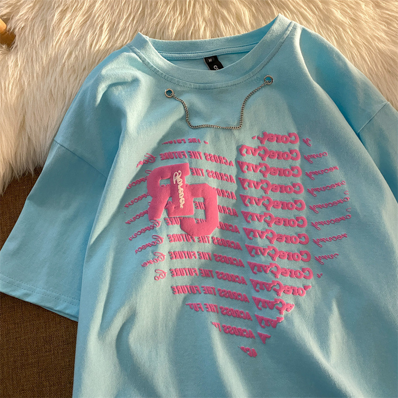 设计感湖蓝色美式复古炸街情侣装夏装爱心印花短袖t恤女宽松潮牌热门设计联盟服务商